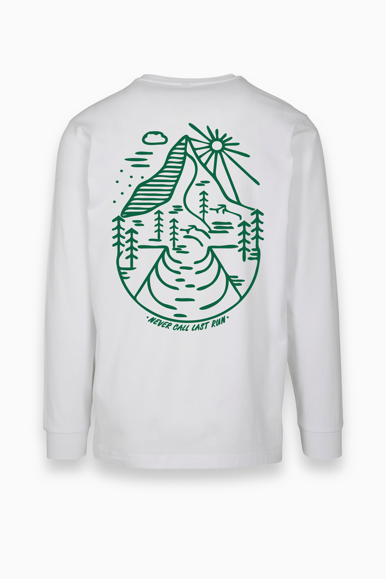 Discover the ultimate Never Call Last Run long-sleeved shirt in brilliant white, featuring a striking mountain and snow park back print in vibrant green! This men's long-sleeved shirt perfectly combines style and functionality. Crafted from high-quality materials, it offers maximum comfort and freedom of movement. Whether on the slopes or in the city, this long-sleeved shirt is an absolute must-have for anyone who values style.